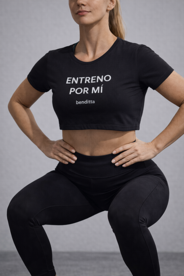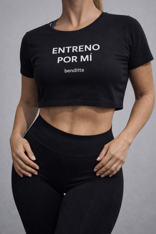 Remera deportiva pupera negra ENTRENO POR MI. Benditta