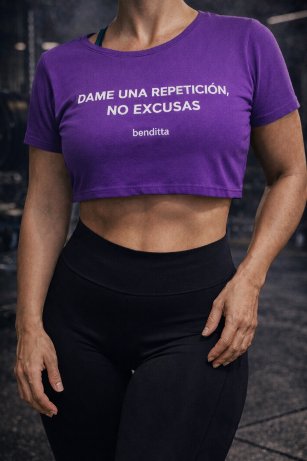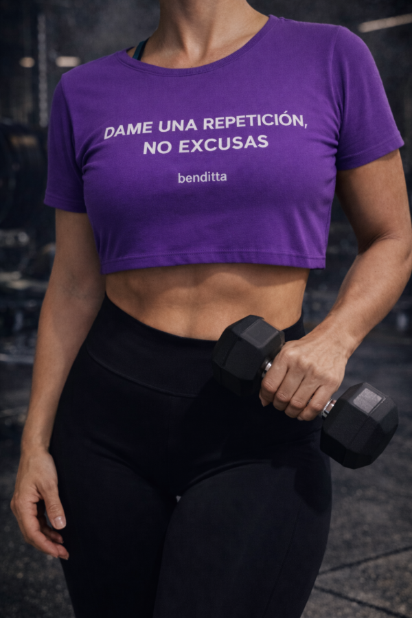 Remera deportiva pupera violeta Dame una repetición, no excusas. Benditta